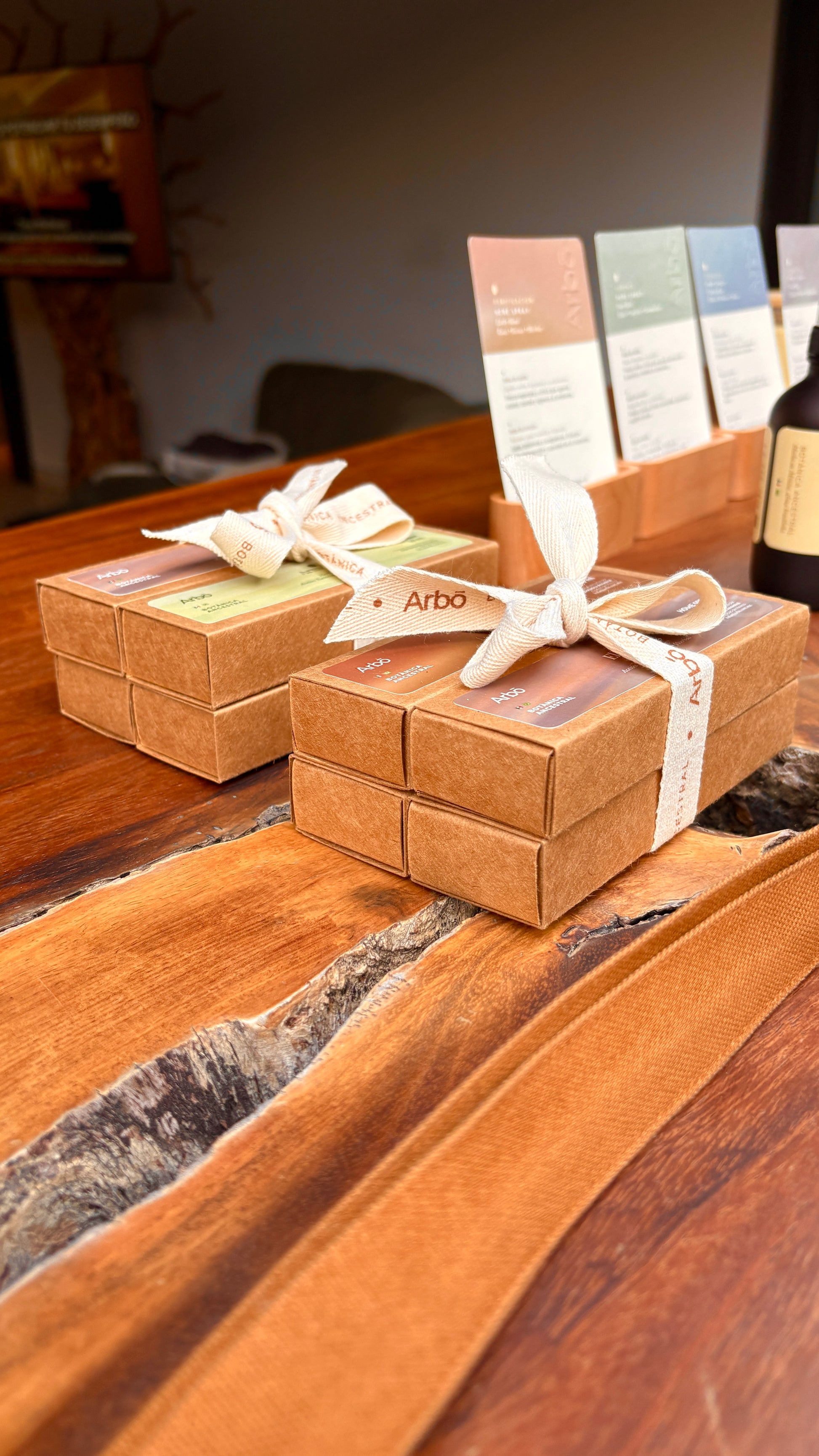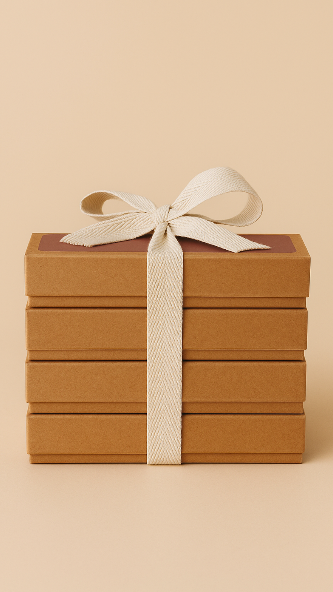 - Presentación en caja kraft apilada con lazo textil de algodón crudo